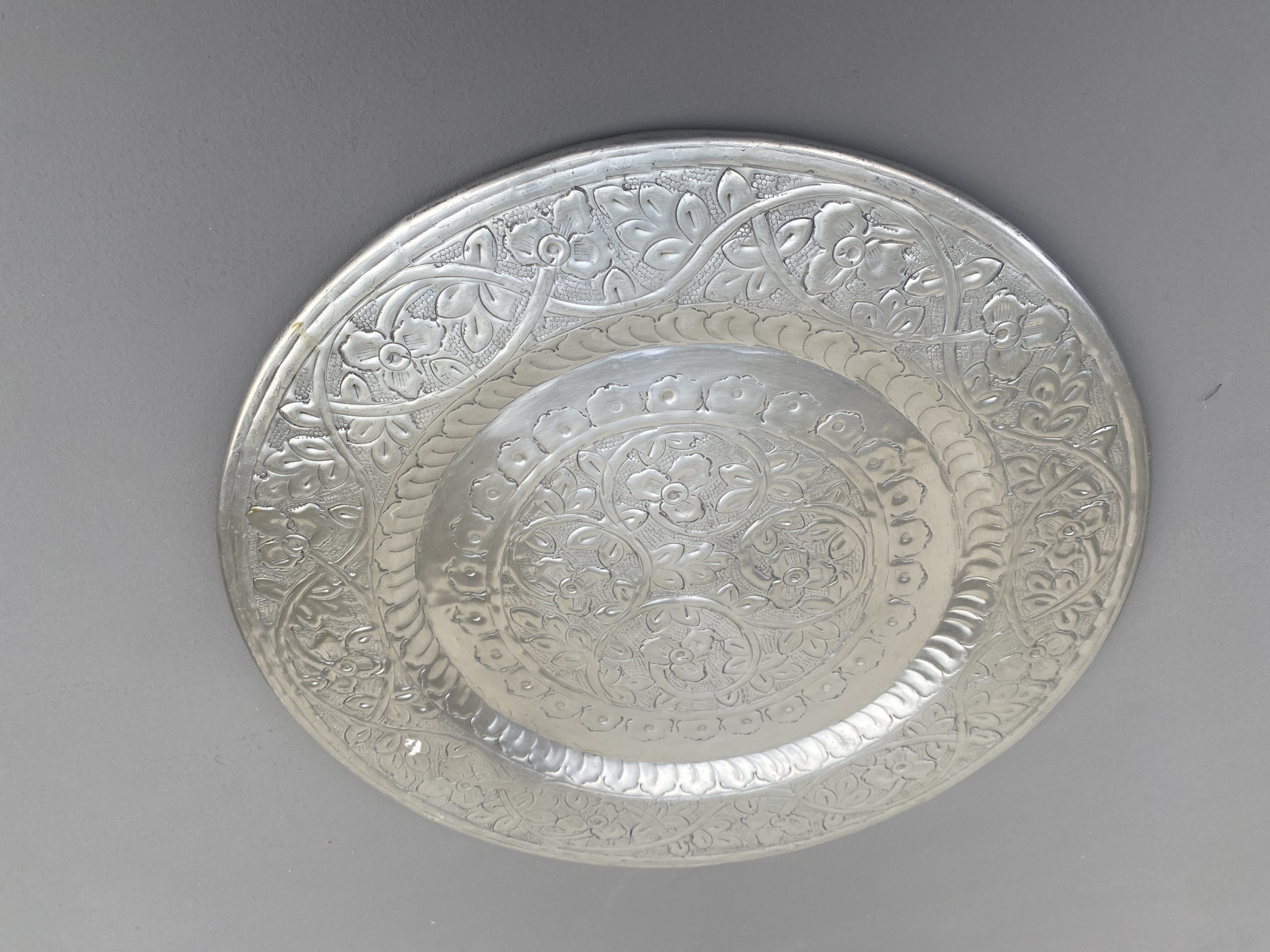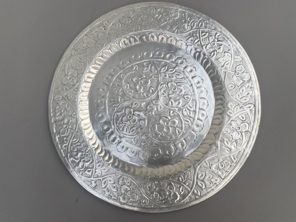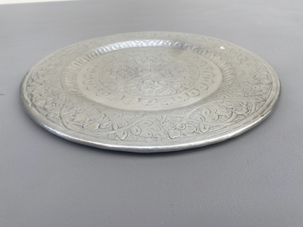 Bord bewerkt metaal zilverkeurig.