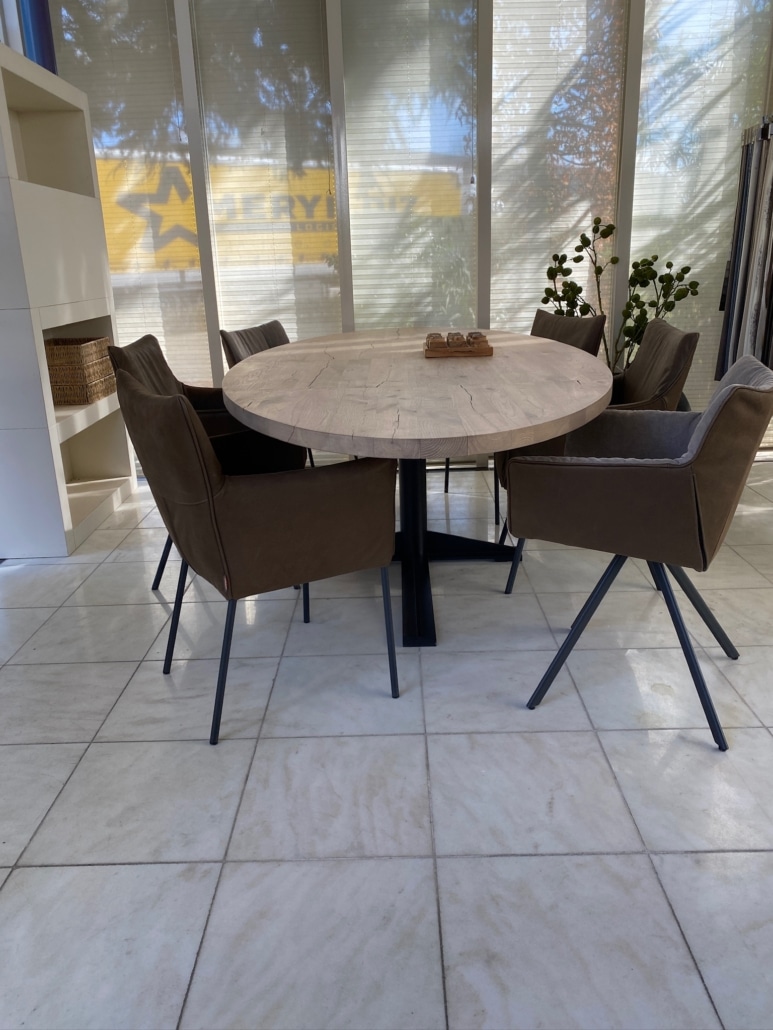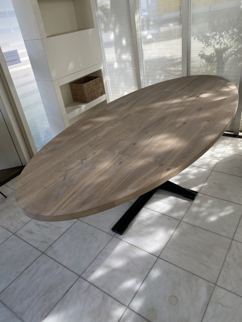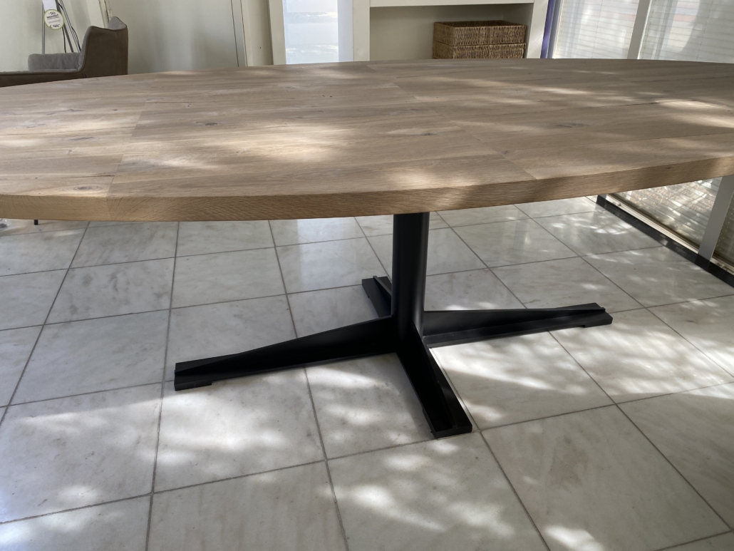 Een echte leeftafel van massief gerookt en gezeept eiken met metalen onderstel. Het blad, uit 4 delen opgebouwd, is rustiek gelaten. De krimscheurtjes geven de tafel een extra robuust chacet. Deze uitvoering maakt de tafel een unieke in zijn soort.