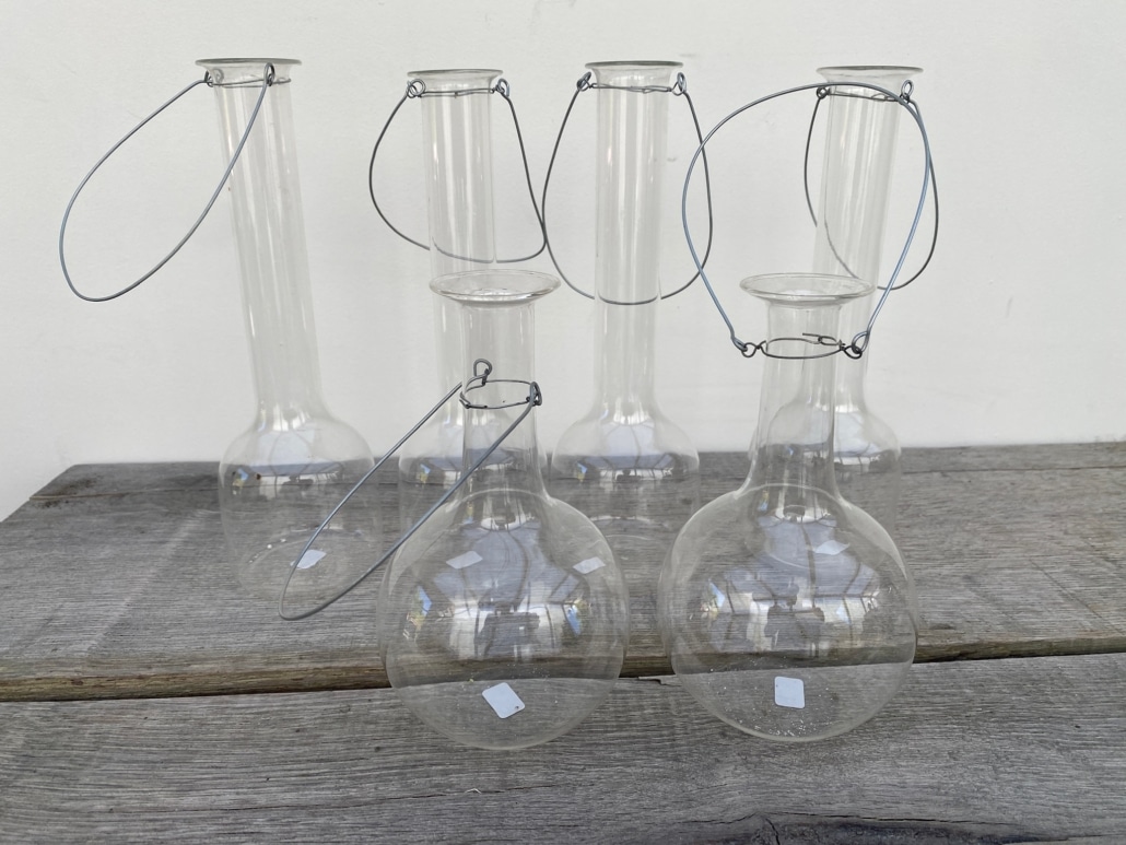 Glazen vaasjes om te hangen of neer te zetten. 6 stuks